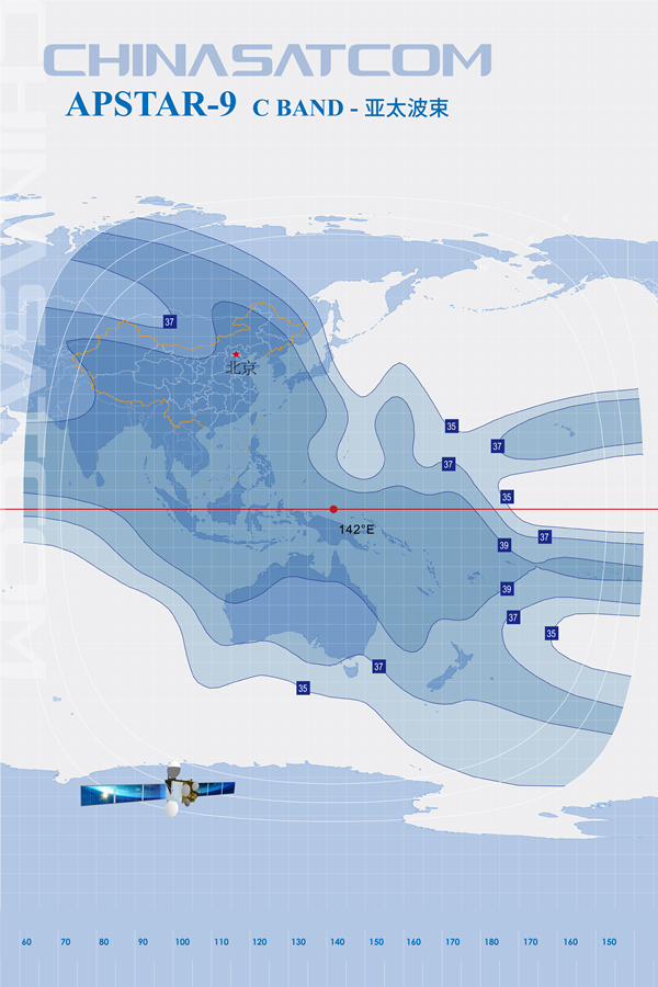 亞太9號衛星的C波段設計有兩個波束:一個覆蓋亞太地區的AP波束,以及一個著重覆蓋東南亞地區的SEA波束,適合于提供視頻廣播、VSAT網絡以及移動網絡基站傳輸等業務。Ku波段覆蓋自印度洋東部到太平洋西部的廣大區域,以及一個移動波束,可以提供電視直接到戶、VSAT、海事和航線寬帶接入等業務。
