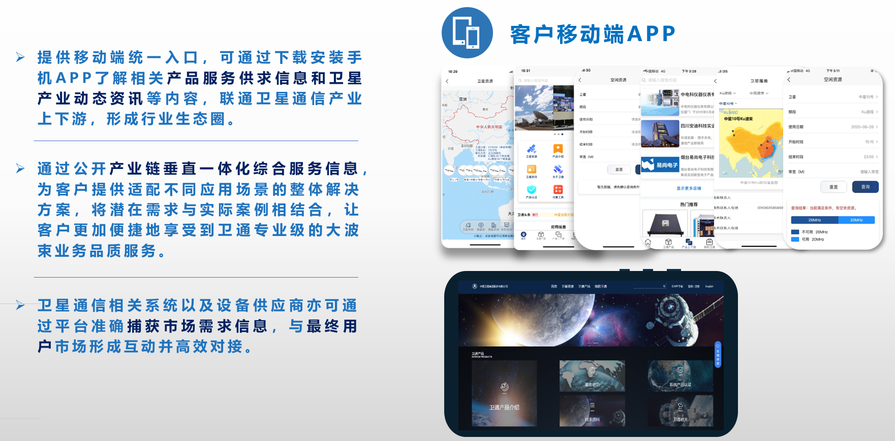 大波束綜合服務平臺將轉發器業務的售前、售中、售后過程中的信息有效集成,對內實現轉發器資源信息、轉發器銷售市場信息、轉發器服務信息、轉發器客戶信息的統一管理;對外建立完善的客戶服務體系,集業務服務、衛星資源查詢、產業鏈上下游資訊、產品推介認證等數十種功能于一體,引入互聯網手段,對全鏈條的服務進行記錄,充分發揮衛通在行業中的優勢,匯聚國內國際衛星通信設備商、集成商信息,向客戶提供衛星通信整體解決方案以及專業級的全流程衛星通信服務。