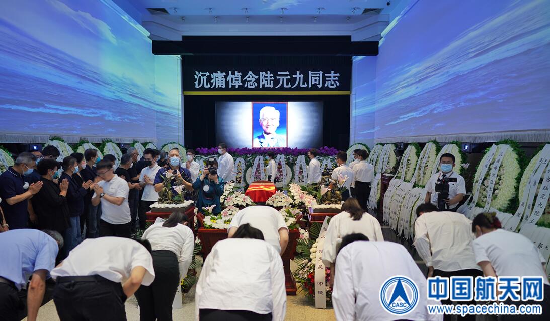 早上9點,上千人聚集在八寶山殯儀館東禮堂門前,陸元九同志的同事、親友、學生、晚輩前來送他最后一程。禮堂門前掛起挽聯:“殫精強國 一縷英魂存海宇”“竭慮宇航 滿腔熱血貫云天”。陸元九同志的遺體安臥在鮮花之中,身上覆蓋著鮮紅的中國共產黨黨旗。