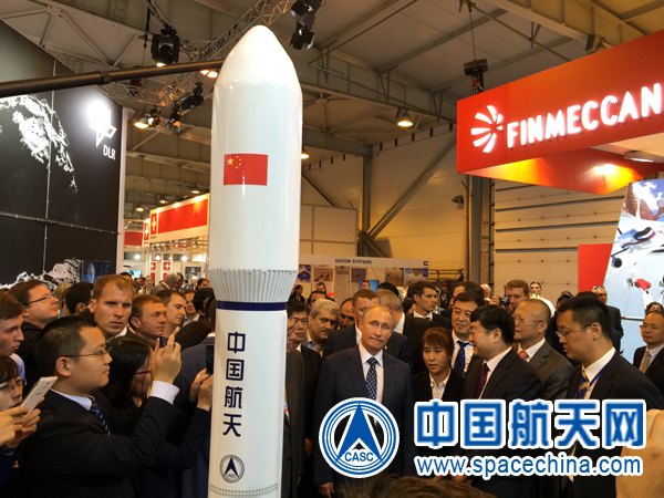 莫斯科當地時間8月25日,第12屆俄羅斯國際航空航天展覽會在莫斯科郊外的茹科夫斯基市隆重開幕,俄羅斯總統普京在開幕式結束后來到了中國航天科技集團公司展臺參觀。他對中國航天科技取得的輝煌成績表示祝賀,并表示將一如既往地支持中俄兩國航天合作,促進兩國友好關系發展。