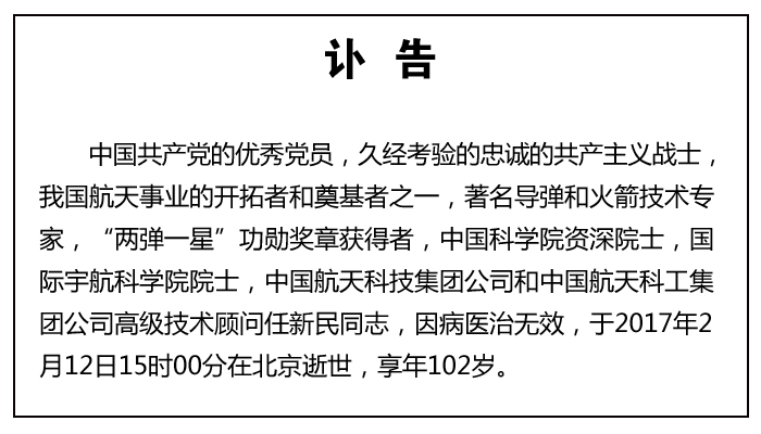 2014年11月,年近百歲的任新民因病住進(jìn)醫(yī)院。住院期間,任新民還時(shí)刻關(guān)心我國(guó)新一代運(yùn)載火箭的研制情況。當(dāng)中國(guó)航天科技集團(tuán)公司黨組書(shū)記、董事長(zhǎng)雷凡培去醫(yī)院看望他,并向他匯報(bào)新一代運(yùn)載火箭在研制過(guò)程中取得的最新進(jìn)展時(shí),任新民聽(tīng)了非常高興,他說(shuō):“真希望‘長(zhǎng)五’早點(diǎn)飛上天啊。”