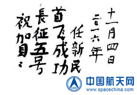 2016年11月3日長(zhǎng)征五號(hào)運(yùn)載火箭發(fā)射成功后,任新民題字祝賀。
