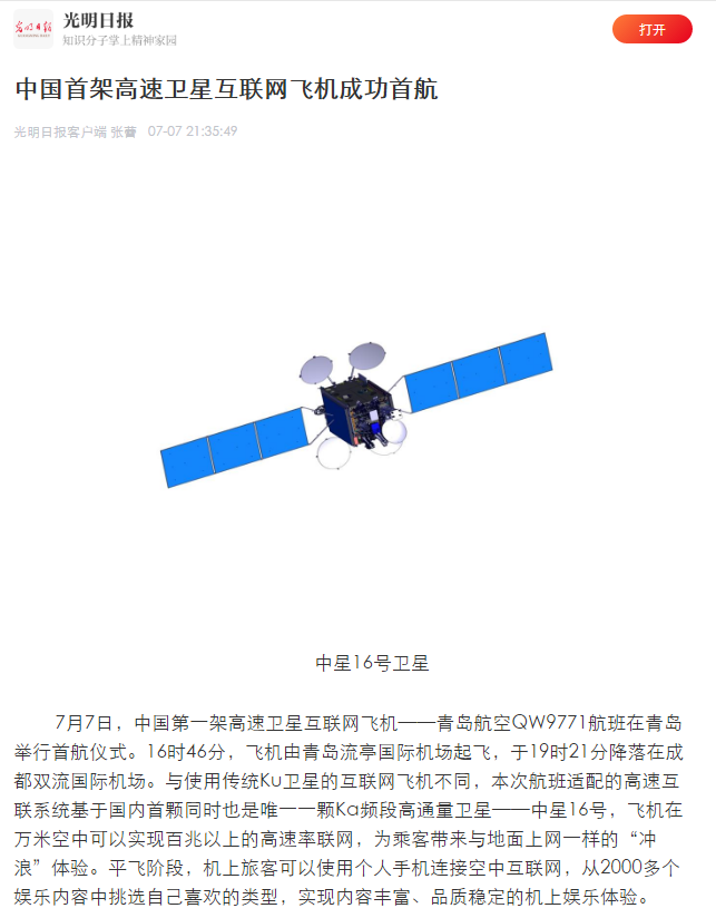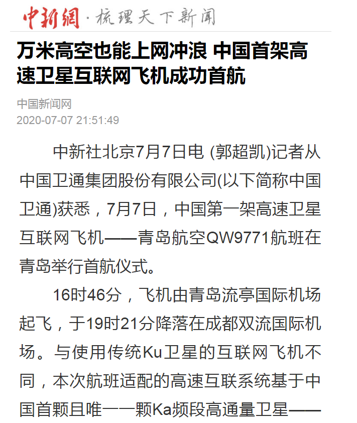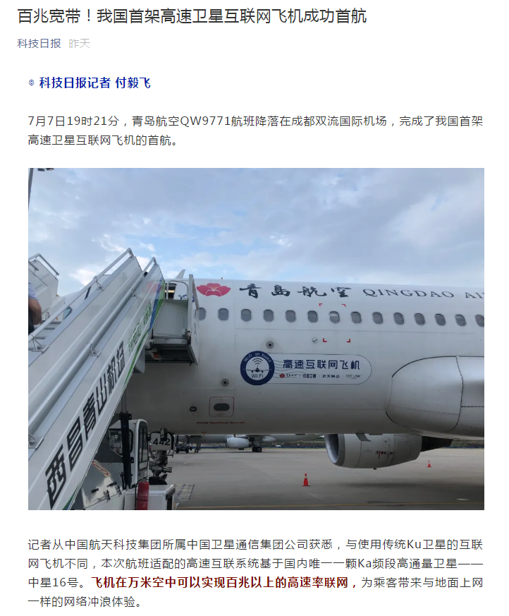 7月7日,國內首架高速衛星互聯網飛機——青島航空QW9771航班完成首航。本次首航的高通量衛星資源由中國衛通集團股份有限公司提供。