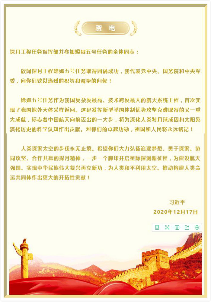 12月17日1時(shí)59分,嫦娥五號(hào)返回器攜帶月球樣品在內(nèi)蒙古四子王旗預(yù)定區(qū)域安全著陸,探月工程嫦娥五號(hào)任務(wù)取得圓滿成功。中共中央總書記、國(guó)家主席、中央軍委主席習(xí)近平發(fā)來(lái)賀電,代表黨中央、國(guó)務(wù)院和中央軍委,向探月工程任務(wù)指揮部并參加嫦娥五號(hào)任務(wù)的全體同志致以熱烈的祝賀和誠(chéng)摯的問(wèn)候。