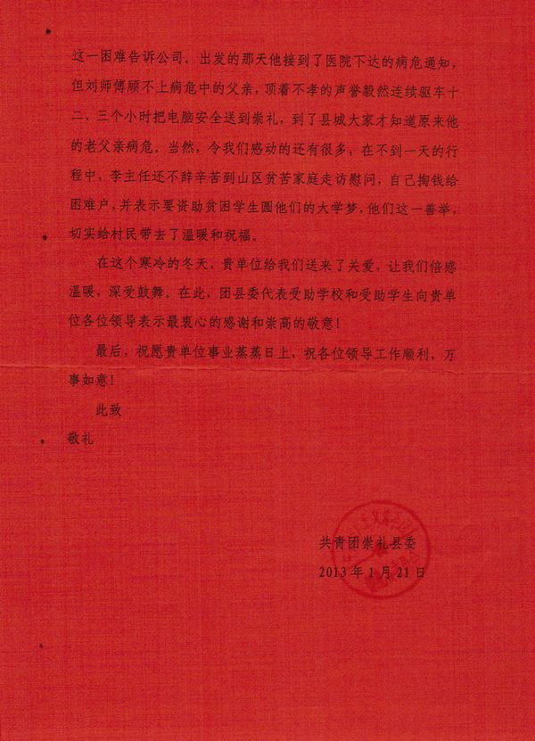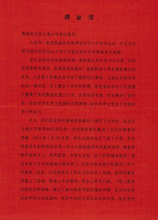 2月4日,共青團崇禮縣委向中國衛通發來一封感謝信,代表崇禮縣貧困山區學校和貧困學生對中國衛通扶貧捐贈活動表達了衷心的感謝和崇高的敬意,語言質樸卻情真意切。